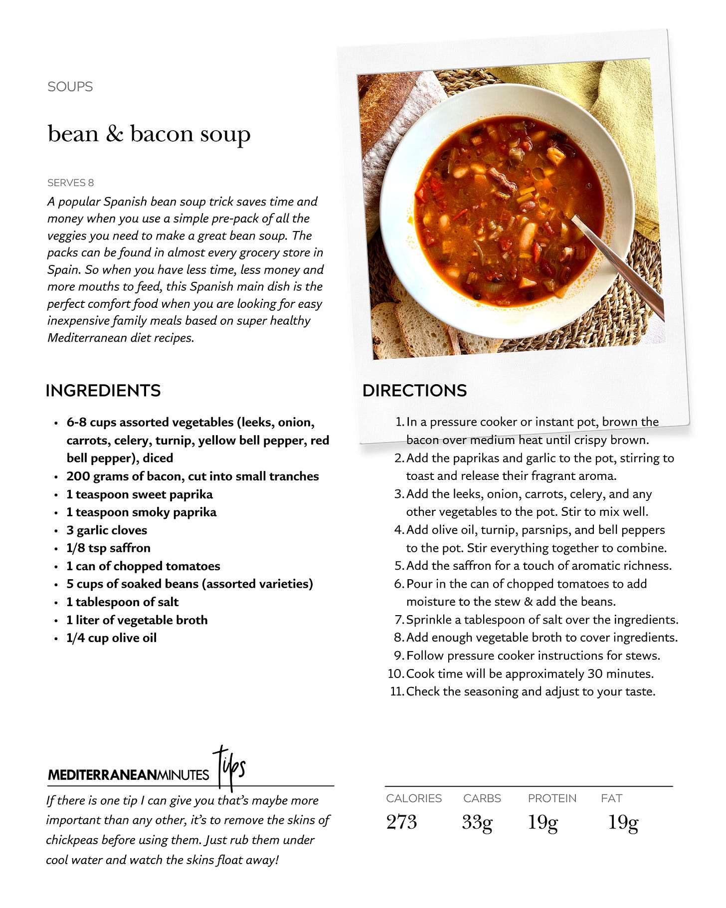 A popular Spanish bean soup trick saves time and money when you use a simple pre-pack of all the veggies you need to make a great bean soup.
