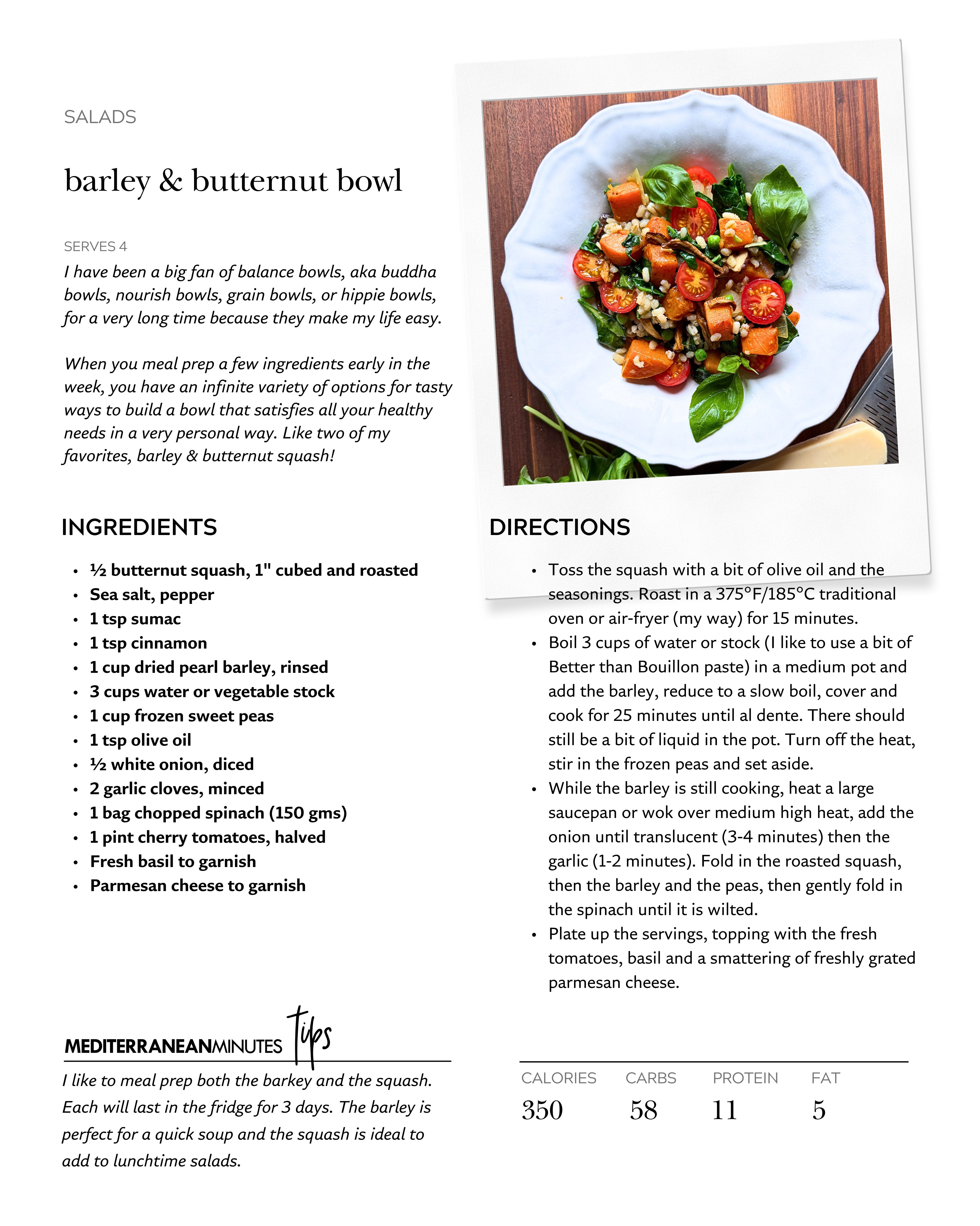 When you meal prep a few ingredients early in the week, you have an infinite variety of options for tasty ways to build a bowl that satisfies all your healthy needs in a very personal way. Like two of my favorites, barley & butternut squash, that you’ll find in the recipe below.