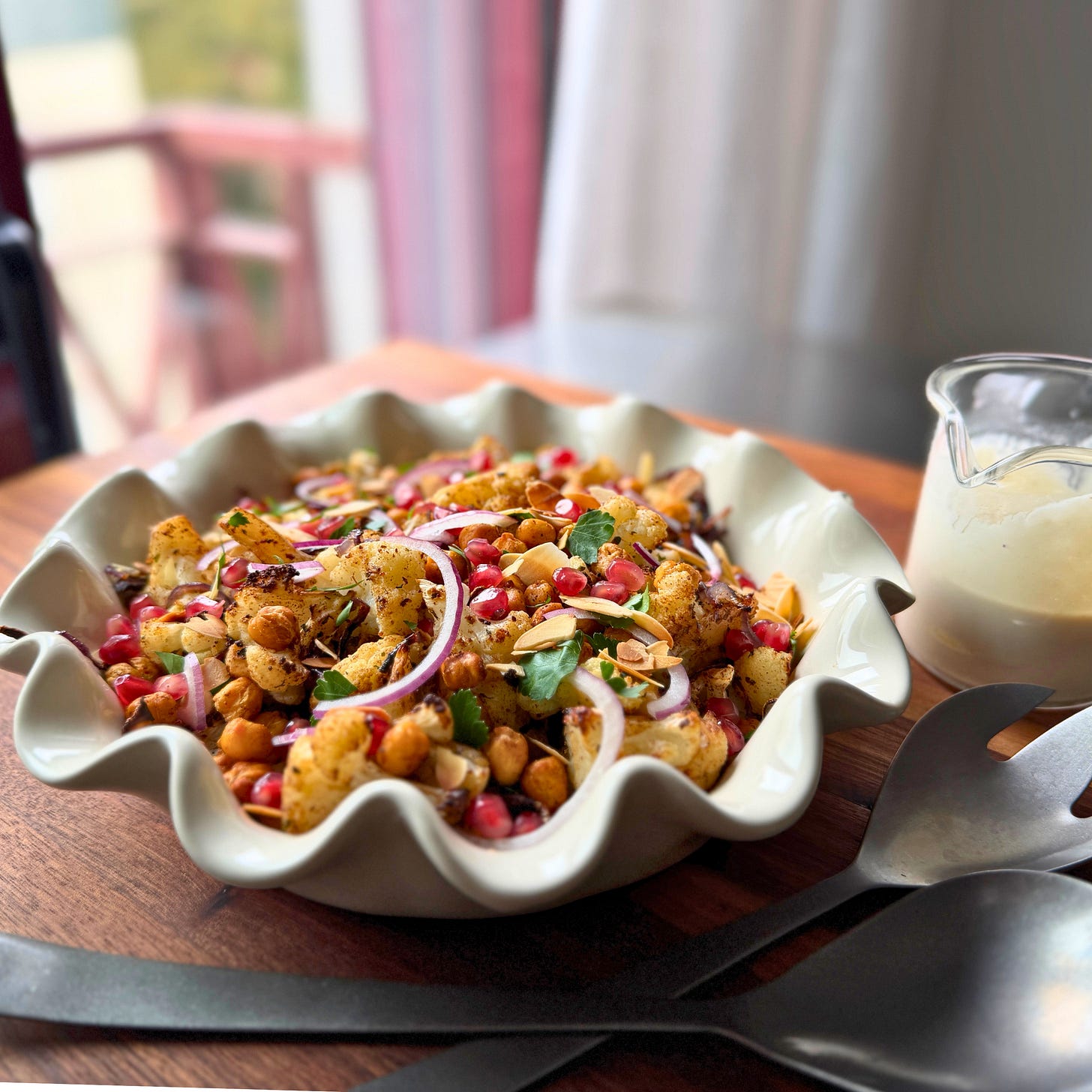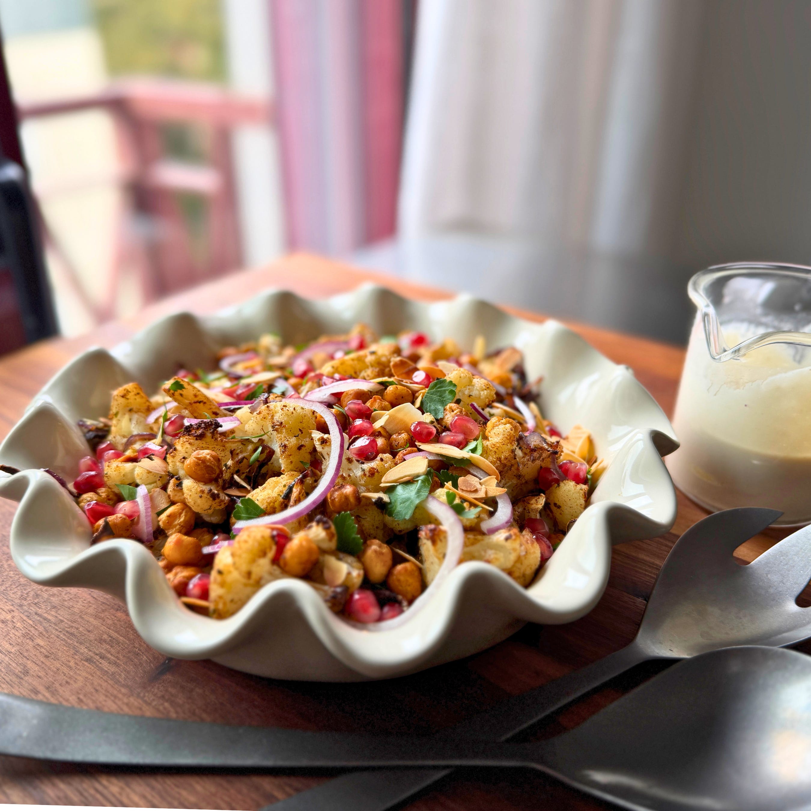 Cauliflower is such a shape shifter. One pan of roasted cauliflower florets, spiced and lightly dressed in extra virgin olive oil will yield more than this colorful salad really needs. If you have some left over, whirl it into a dip for an evening snack, or if it’s a really big head, you might have enough to add to a creamy soup.