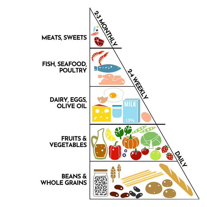 Maybe you’ve noticed I try to feature a different segment of the Mediterranean diet every week. Each slice of the pie or the pyramid gets a little or a lot of attention based on where it sits.