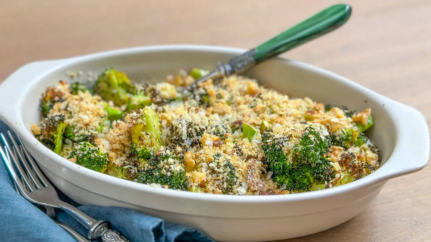 The florets and stems roast for a few minutes until the edges start to caramelize, before being topped with the crunchy mixture of toasted breadcrumbs, walnuts, Parmesan cheese and anchovies. And in a matter of minutes, dinner heads straight to the table.