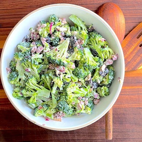 Knowing that the dish leans on the rich side (aka higher fat content), I built the rest of today’s menu to make sure we keep it light and balanced and recipe-free — berries & ricotta in the morning, grilled salmon at lunch, fresh fruit and yogurt for snacks, and a simple green salad alongside the broccoli at dinner.