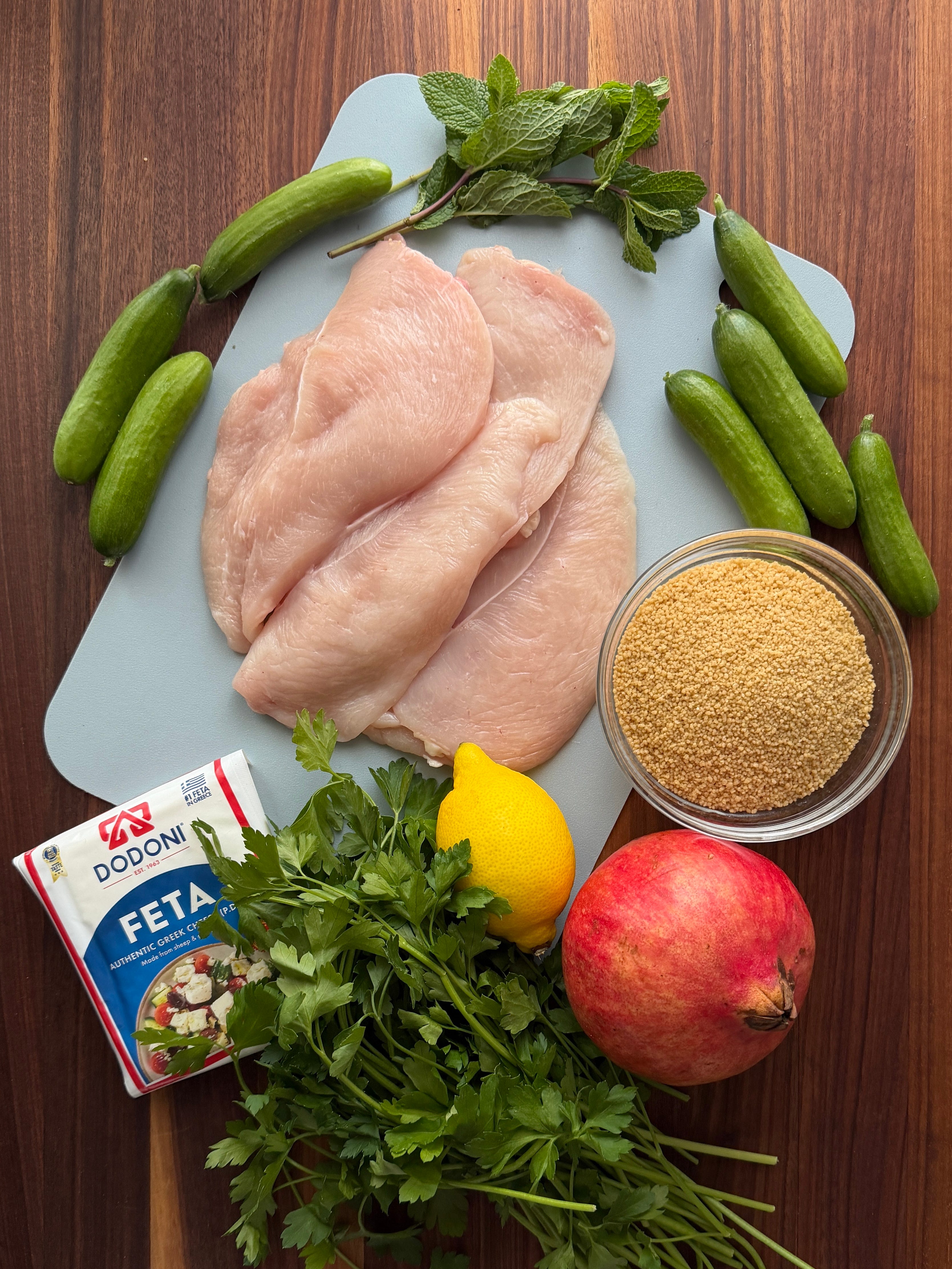 No feta? No problem. Substitute some other crumbling cheese or pistachios. No chicken? No problem. Substitute another lean white meat or fish. Big or small cucumbers, no matter. I wouldn’t say the pomegranate arils are a “must have”, you could get away without them although I wouldn’t.