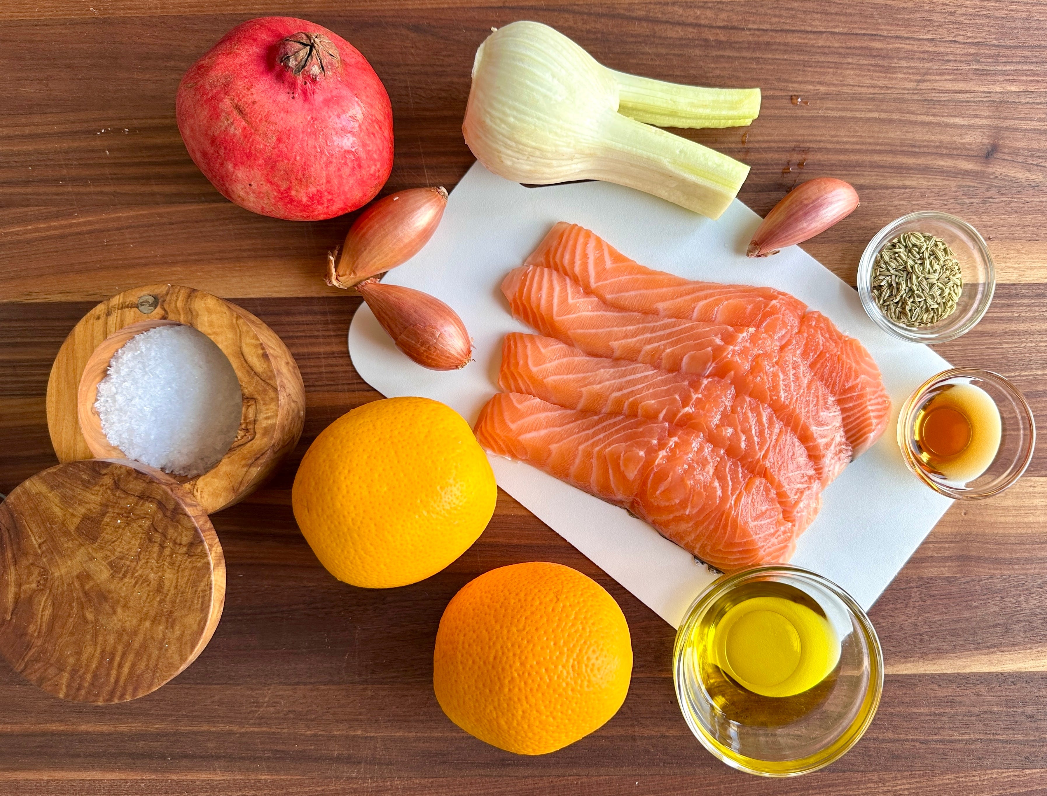 Now that fall and winter ingredients are starting to show up at the mercado, I’m featuring a recipe in today’s menu that I’ve loved for years. Seductively seasoned grilled salmon resting atop a delightful bed of succulent oranges, infused with anise-flavoring and topped with the vibrant crunch of pomegranate arils. A perfect flavor combination… and not a bad color wave on the plate too - if you’re into that sort of thing!