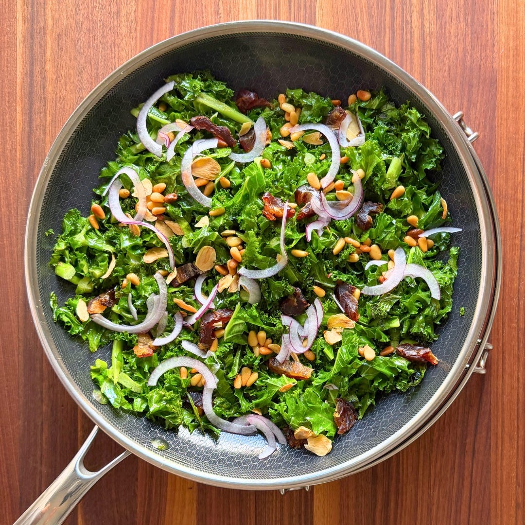 If you’re in the mood to get dressed up and have some pine nuts, dates and red onion like I did when I made it this week, go ahead and toss them in.
