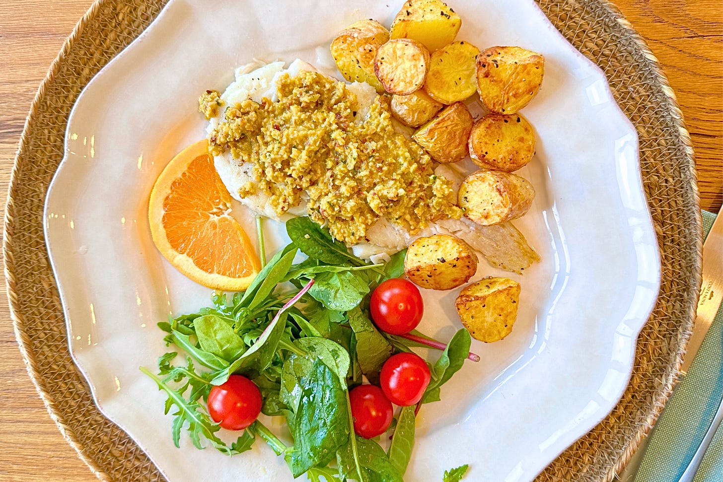 White fish, especially cod or hake, is a favorite in Mediterranean kitchens. Dressing a fillet with classic Spanish ingredients from my hometown Valencian region like almonds, green olives, oranges & olive oil brings it that much closer to home.